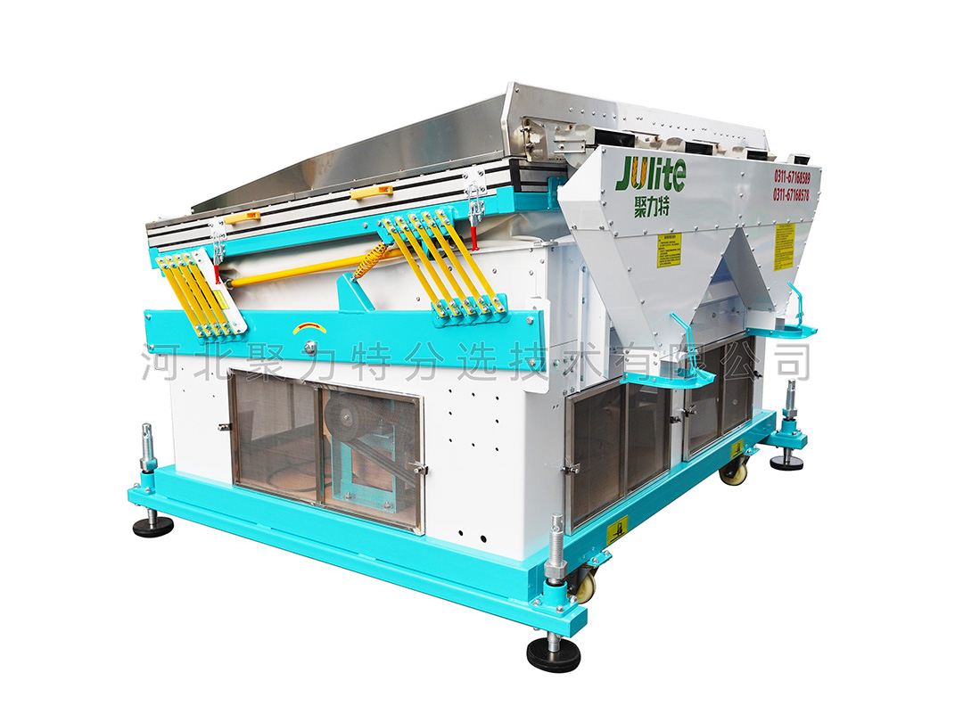 適用于單一目的物料的選別,能把物料中的并肩石(與物料粒度大小相似的砂石)等較重的雜質(zhì)有效去除。在糧食加工的工藝流程中應安裝在篩選流程的后段工序,未經(jīng)去除大、小、輕雜質(zhì)的原料,不應直接進入該機,以避免影響去石效果。