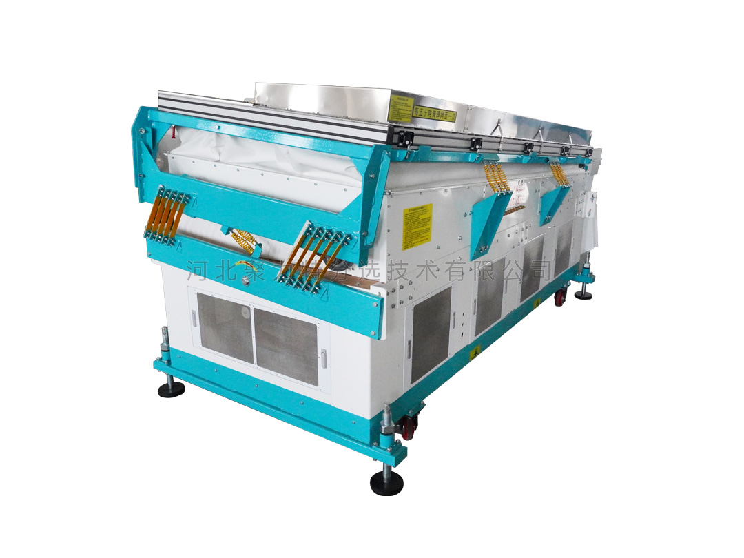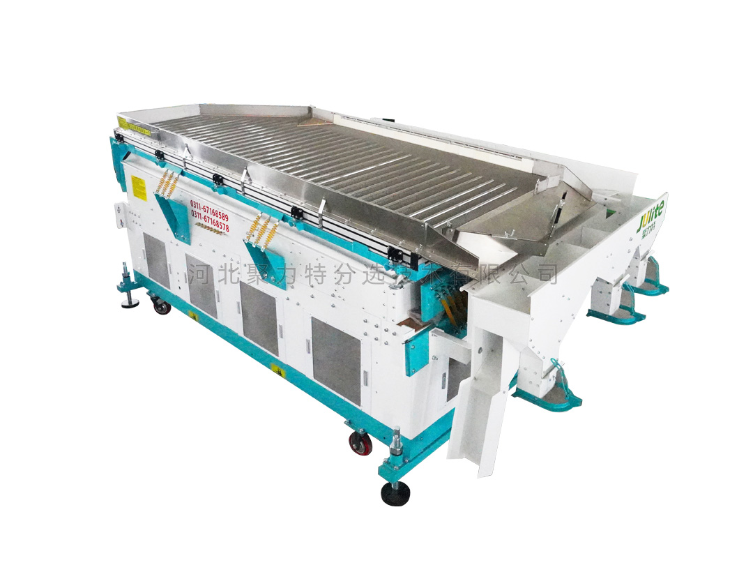 吹式比重精選機(jī)是根據(jù)物料在空氣動力和振動摩擦力的雙重作用下產(chǎn)生比重偏析的原理,通過調(diào)整風(fēng)壓、振幅等技術(shù)參數(shù),使比重較大的物料沉到底部貼著篩面由低向高運動;比重較小的物料懸浮在表面由高向低運動,從而達(dá)到比重分離的目的。有效去除物料中的秕籽、芽籽、蟲蛀粒、霉變粒、黑粉病粒等比重較輕的雜質(zhì);側(cè)面增加成品側(cè)出糧功能,增大產(chǎn)量;同時比重精選機(jī)振動臺面上部設(shè)有一個去石傾角,能將物料中的石子分離出來。