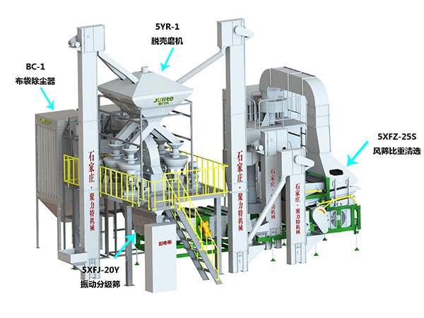 薏仁米脫殼分選生產(chǎn)線由脫殼磨機(jī)、風(fēng)篩比重清選機(jī)、雙篩箱振動(dòng)篩、風(fēng)選系統(tǒng)、螺旋除塵器、提升機(jī)、原料倉(cāng)、布袋除塵器、輔助設(shè)備(含電控系統(tǒng)、風(fēng)網(wǎng)管道、輸料管道)等設(shè)備組成。