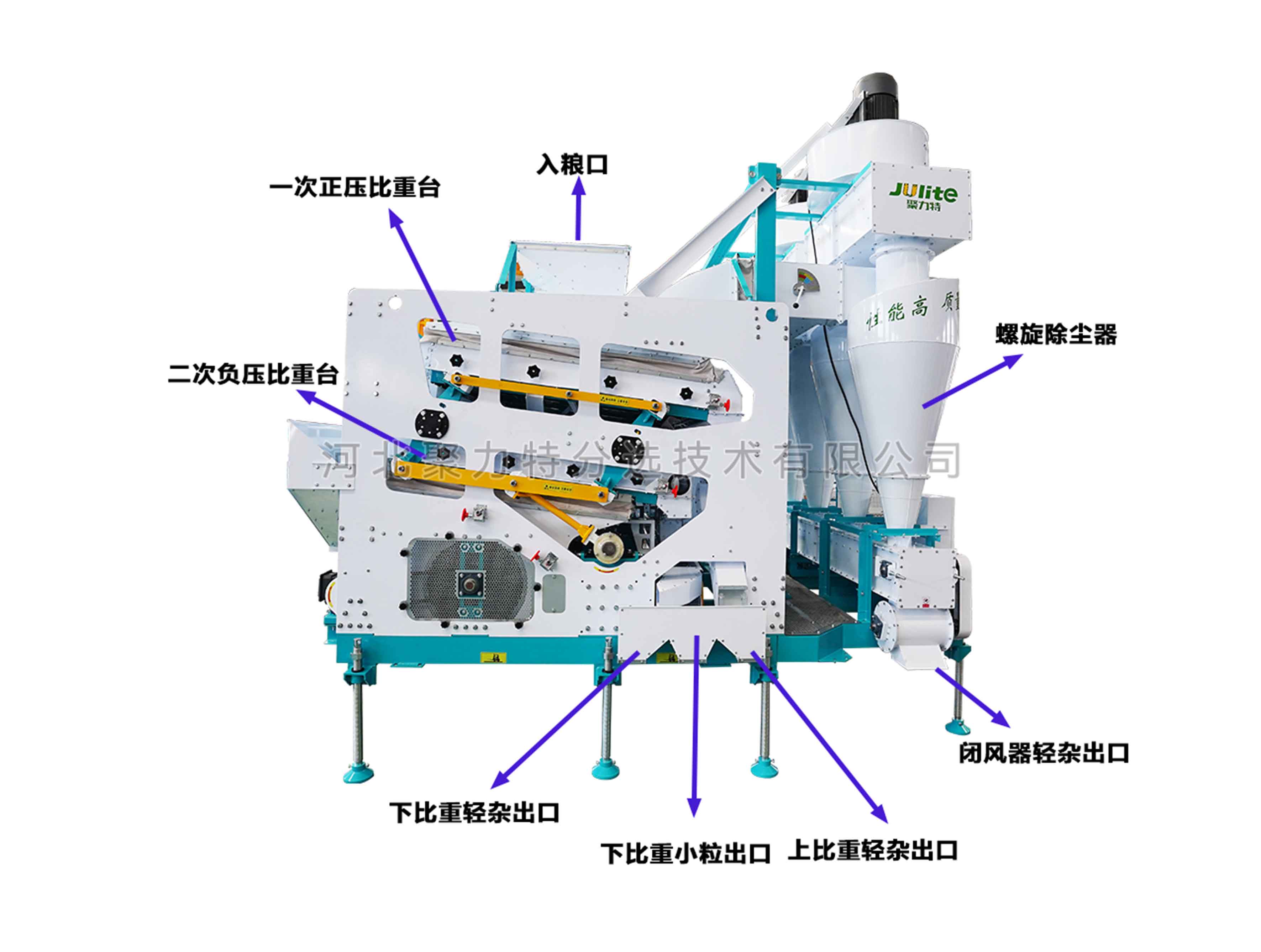 物料通過輸送設(shè)備經(jīng)喂入斗進(jìn)入第一道負(fù)壓比重臺(tái),通過風(fēng)選去除物料中的粉塵、糠殼等輕雜質(zhì),輕雜經(jīng)風(fēng)道、螺旋除塵器,由閉風(fēng)器排出收集;通過比重選有效去除物料中的秸稈、軸塊等比重較輕的雜質(zhì)。后物料通過導(dǎo)糧機(jī)構(gòu)進(jìn)入第二道正壓比重臺(tái),通過調(diào)整風(fēng)量、擋板位置等進(jìn)行比重加工,有效去除物料中的碎粒、秕籽、芽粒、蟲蛀粒、霉變粒等雜質(zhì)。最終成品從比重臺(tái)高處排出。